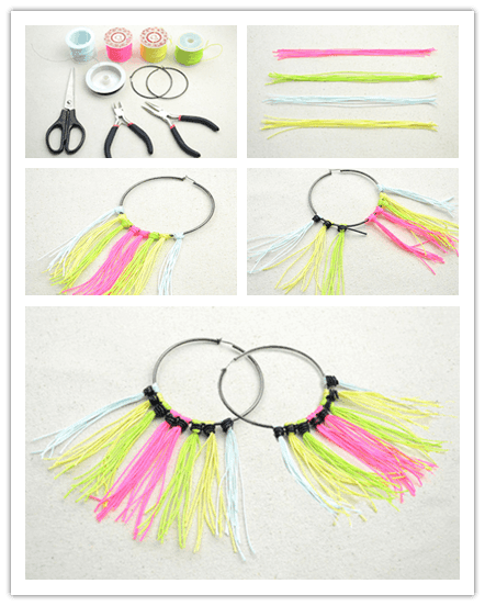 Premièrement, prenez des fils de nylon et coupez les à 10 segments. Chaque pièce mesure environ 10cm. Ensuite prenez 5 brins de fil rose, attachez les dans la boucle par un noeud de tête d'alouette, puis ajoutez des fils citrons verts, des fils jaunes et des fils bleus clairs. La couleur de fil est tout à fait selon vous. A la fin, prenez un brin de fil de cuivre pour envelopper chaque noeud dans la boucle. Et voilà, une paire de boucles d’oreilles en fil coloré sont finie ! C’est vraiment simple, n’est-ce pas ?