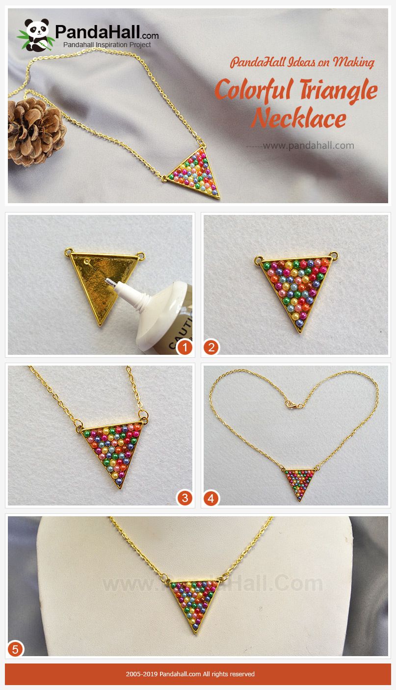 Ce collier simple est composé principalement par un breloque triangle et les chaînes pour collier. Par ailleurs, nous collons les perles acryliques colorées au breloque. L’opération est assez facile, n’est ce pas? N’hésitez pas à essayer de faire un même collier par vous-même!